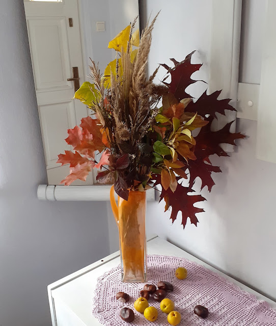 Maj, czy październik? Dziś bukiet trochę "bałaganiarski". Postanowiłam zbierać wszystko, co jeszcze kwitnie i początkowo myślałam, że niewiele tego będzie. Ostatnie nawłocie, niezawodny krwawnik, jakieś mniszki i mniszkopodobne. Im jednak dalej szłam, tym więcej kwiatów się pojawiało. Typowo letnie chabry i rumianki, pojedyncze młode kłosy owsa i żyta, gałązki rzepaku. Niedaleko działek mało polne marcinki i złocienie. Pogoda wyjątkowo sprzyjała, nawet zdjęcia w altance uważam za dość udane.